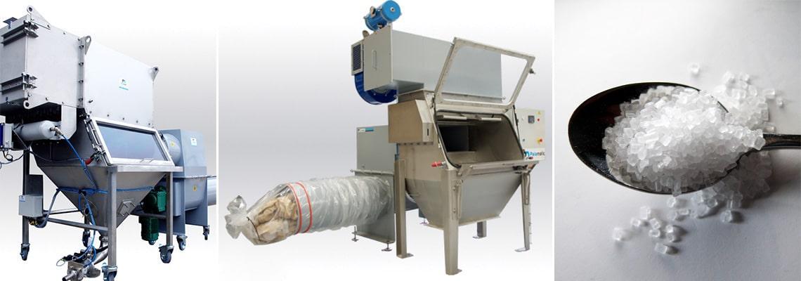 Les processus de manipulation du sucre sont souvent soumis aux exigences de la norme ATEX en raison de la capacité du sucre à s’enflammer dans des circonstances favorables (poussière flottant librement dans l’air, saturation en oxygène et source d'énergie). Pour s’assurer d’un confinement optimal de la poussière, une petite unité de collecte de la poussière sur le dessus de la station de vidange des sacs est installée. Un filtre plissé cylindrique occupe la partie supérieure de la station de manutention. Il est inséré par une porte d'accès boulonnée sur le côté de l'unité qui permet à l’opérateur de le retirer et de le remplacer si nécessaire. Un ventilateur d'extraction crée un léger vide atmosphérique à l'intérieur de la station de vidange des sacs. Lorsque l'opérateur déverse la poudre, toutes les particules de poussières émises sont aspirées dans la cartouche filtrante. L'air propre s'échappe par le conduit d'évacuation. Le moteur du système de dépoussiérage est conçu pour une zone dangereuse de classe 2 / Div 2. Un petit réservoir d'air pressurisé offre des fonctions autonettoyantes pour la hotte de dépoussiérage. Une minuterie envoie des jets d'air propre à l'intérieur de la cartouche filtrante. Ce procédé est souvent appelé nettoyage par jet à impulsion inverse. Toute accumulation excessive de poussière est éliminée du filtre et peut s'écouler dans la trémie, ce qui minimise les pertes de produit. Les éléments filtrants sont dimensionnés en fonction de l'application, mais dans ce cas précis, il s'agit d'une surface filtrante de 8m² de 8 poches avec une longueur d’environ 3 mètres. Le matériau filtrant utilisé est un feutre en polyester avec un traitement oléo-hydrophobe.