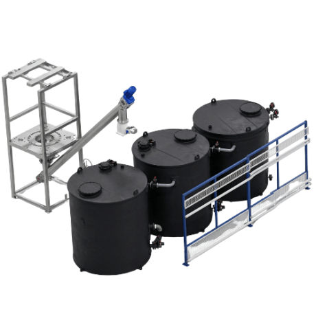 - Vortex contrôlé : La cuve en PEHD noir (haute densité) est équipée d'un mélangeur à haut pouvoir cisaillant et de pales anti-vortex.